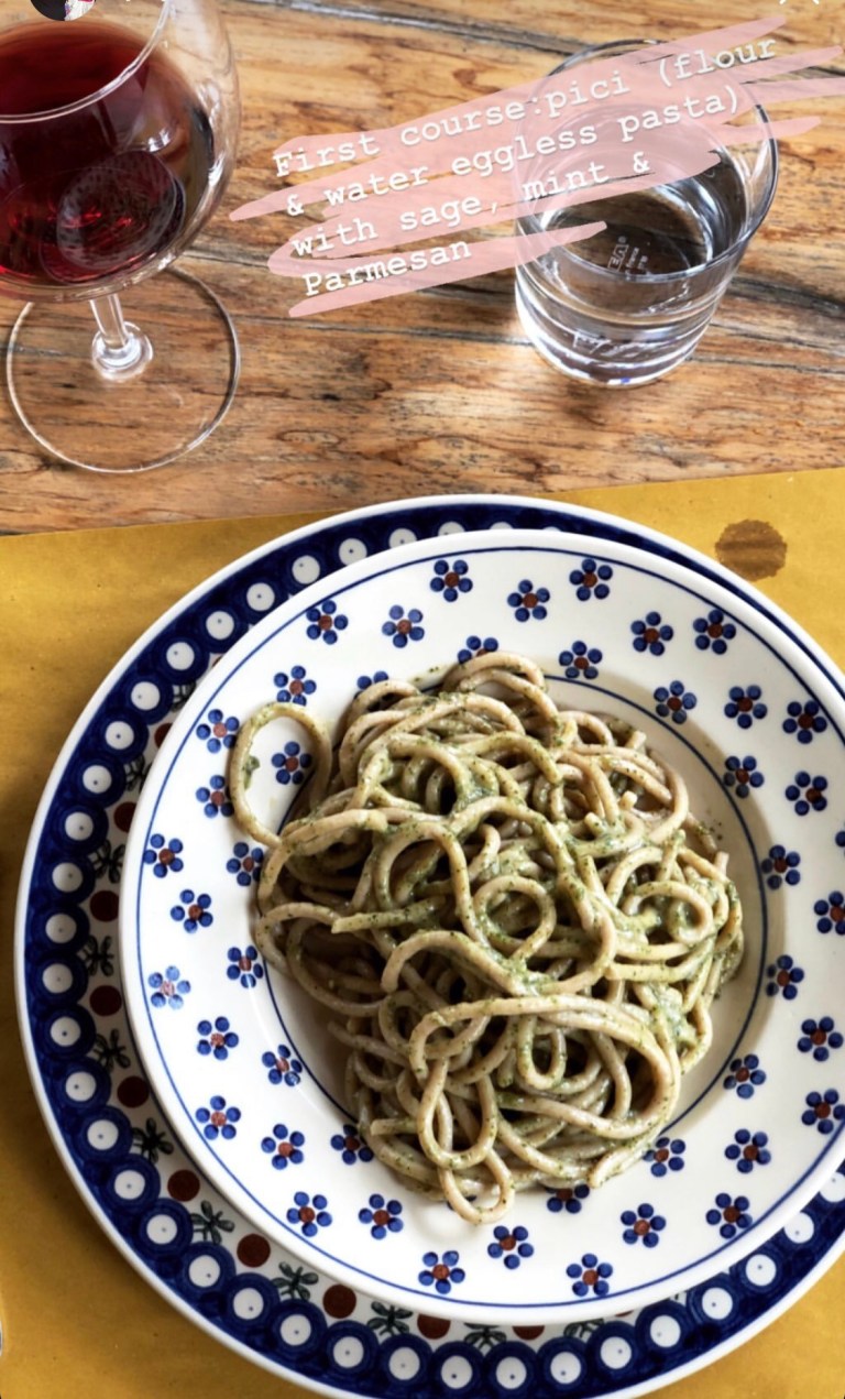 Our first course was Pici. Elena hand made this egg free pasta (with organic flour from her neighbor) with sage, mint and parmesan paired with their standard Chianti Classico, 2014. It was out of control. The wine was so easy to drink-not heavy at all, but still very enjoyable and present flavor notes to it. A great everyday choice.